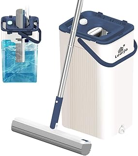 LEARJA スポンジモップ プレミアムPVAモップ ハンズフリー洗浄 プロフェッショナルモップ床掃除 アップグレード 絞りモップとバケツ リンガーセット 硬材ラミネート用 (ブルーバケツ1個 + イエローモップヘッド1個)