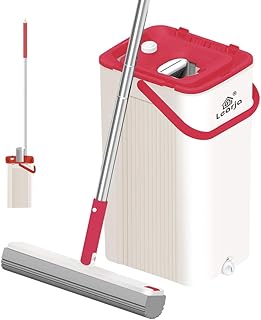 LEARJA スポンジモップ シングルバケツ セルフリンガーとクリーニング 超吸収モップ拡張ハンドル スクイーズ コンパクトフロアモップバケツ 収納簡単 (レッドバケツ+グレーモップヘッド)