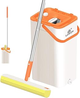 LEARJA スポンジモップ プレミアムPVAモップ ハンズフリー 洗濯 プロフェッショナルモップ床掃除 スクイズモップとバケツ 硬材ラミネート用 (オレンジバケツ1個 + イエローモップヘッド1個)