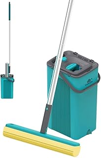 LEARJA スポンジモップ シングルバケツ セルフリンガー&クリーニング 超吸収モップ伸縮ハンドル スクイーズ コンパクトフロアモップバケツ 収納簡単 (ブルーバケツ+グレーモップヘッド)