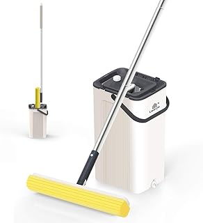 LEARJA スポンジモップ プレミアムPVAモップ ハンズフリー 洗える プロフェッショナルモップ 床掃除用 アップグレードスクイーズモップとバケツ 絞り器セット ベージュバケツ 1個 + イエローモップヘッド1個